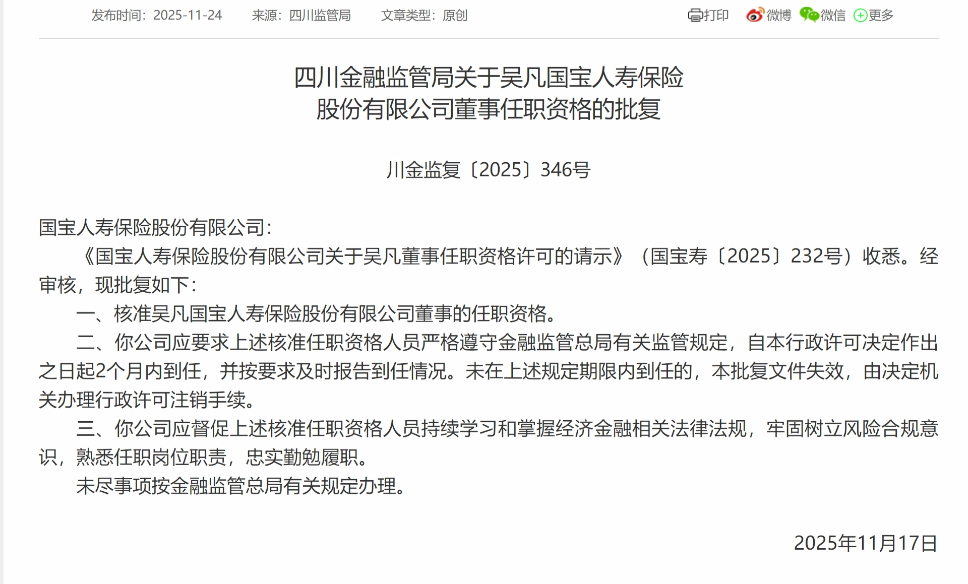 11月24日,四川金融监管局发布《关于吴凡国宝人寿保险股份有限公司董事任职资格的批复》,核准吴凡国宝人寿保险股份有限公司董事的任职资格。